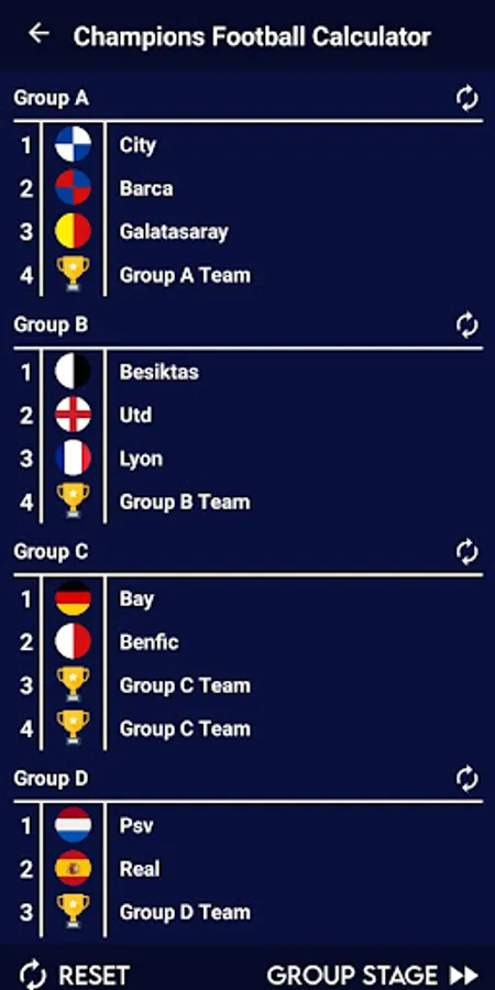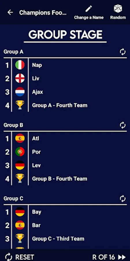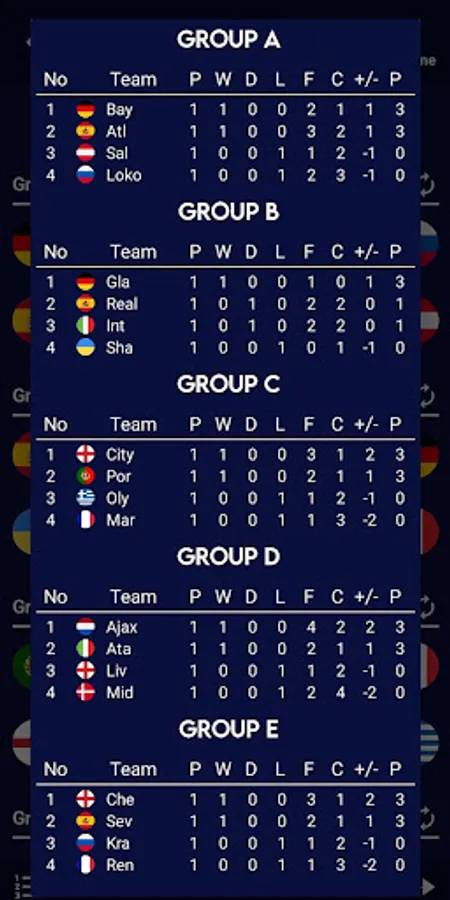 In this app, you can simulate the the best league of the Europe's matches of the 2023/24 season. If you want you can simulate all of the 96 matches of the group stage and proceed to the knockout stages or you can rank group teams and proceed.