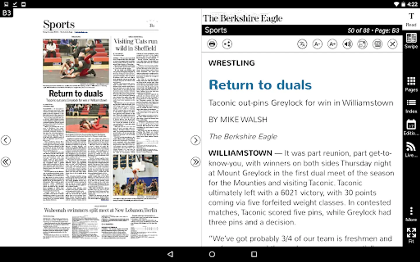 Read local and late breaking news in the Berkshires, while staying connected to national and world-wide news. The app allows you to browse by sections, articles, past editions, and conduct keyword search. Text-to-speech option will narrate any story to you; and language translator works with several languages.