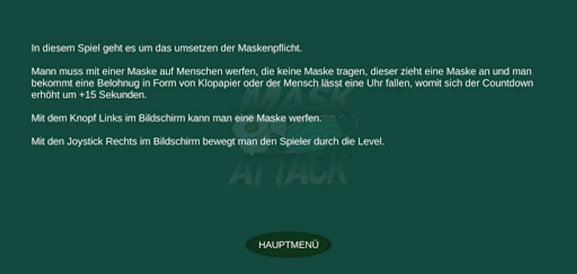 Mask Attack is about handing out masks. To citizens who do not want to stick to it to wear a mask. You then get toilet paper with the man level and you can unlock it or you get a clock to have more time for throwing people at people (updates will follow).