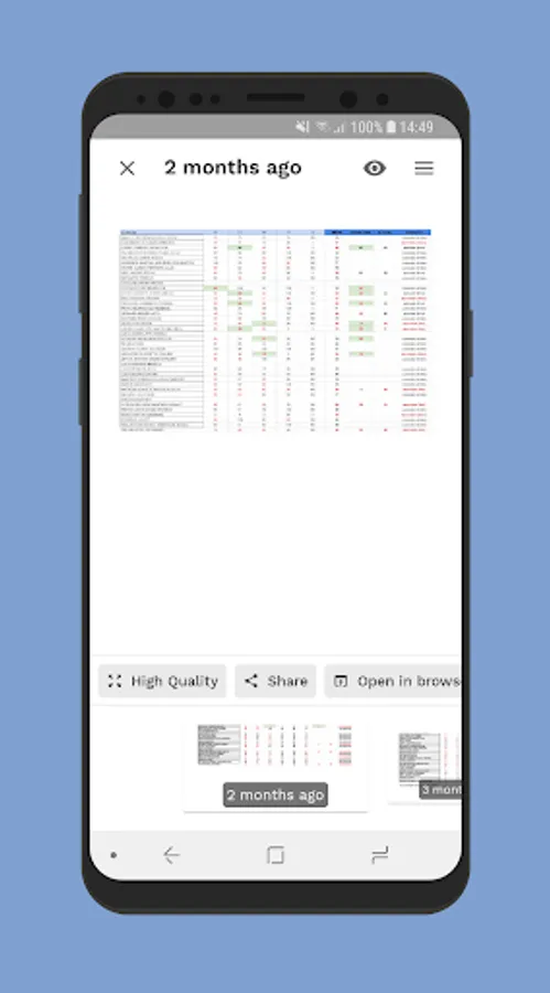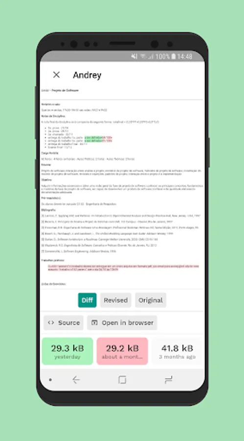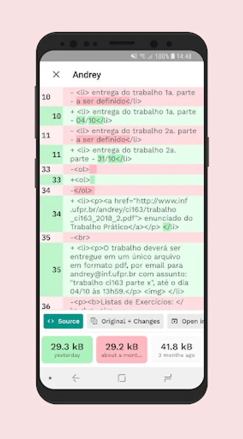 When a change is detected on background, a notification (alert) is displayed. It currently doesn't work with login pages, but contributions are welcome. There are 3 viewers for the app, a text viewer that compares website history in a git-like way, with line by line added/removed and green/red, a pdf viewer which displays multi-paged PDFs on a carousel like interface, inspired by Lottie's open source sample app, and an image viewer, similar to the Pdf viewer, but with support for tiling (which allows heavy pictures to load faster and with lower memory).