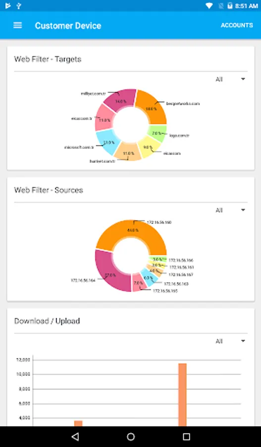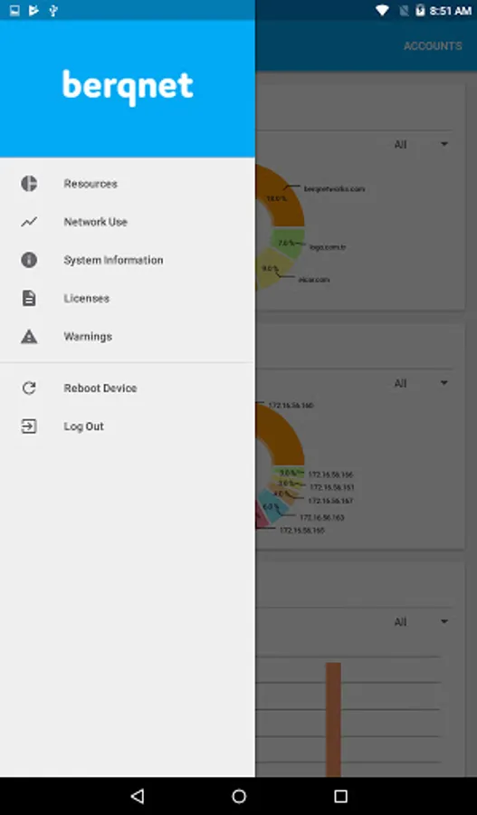 Berqnet report application connects to a berqnet firewall and easily monitors important reports like traffic, web usage, resources, services, warnings, licenses.