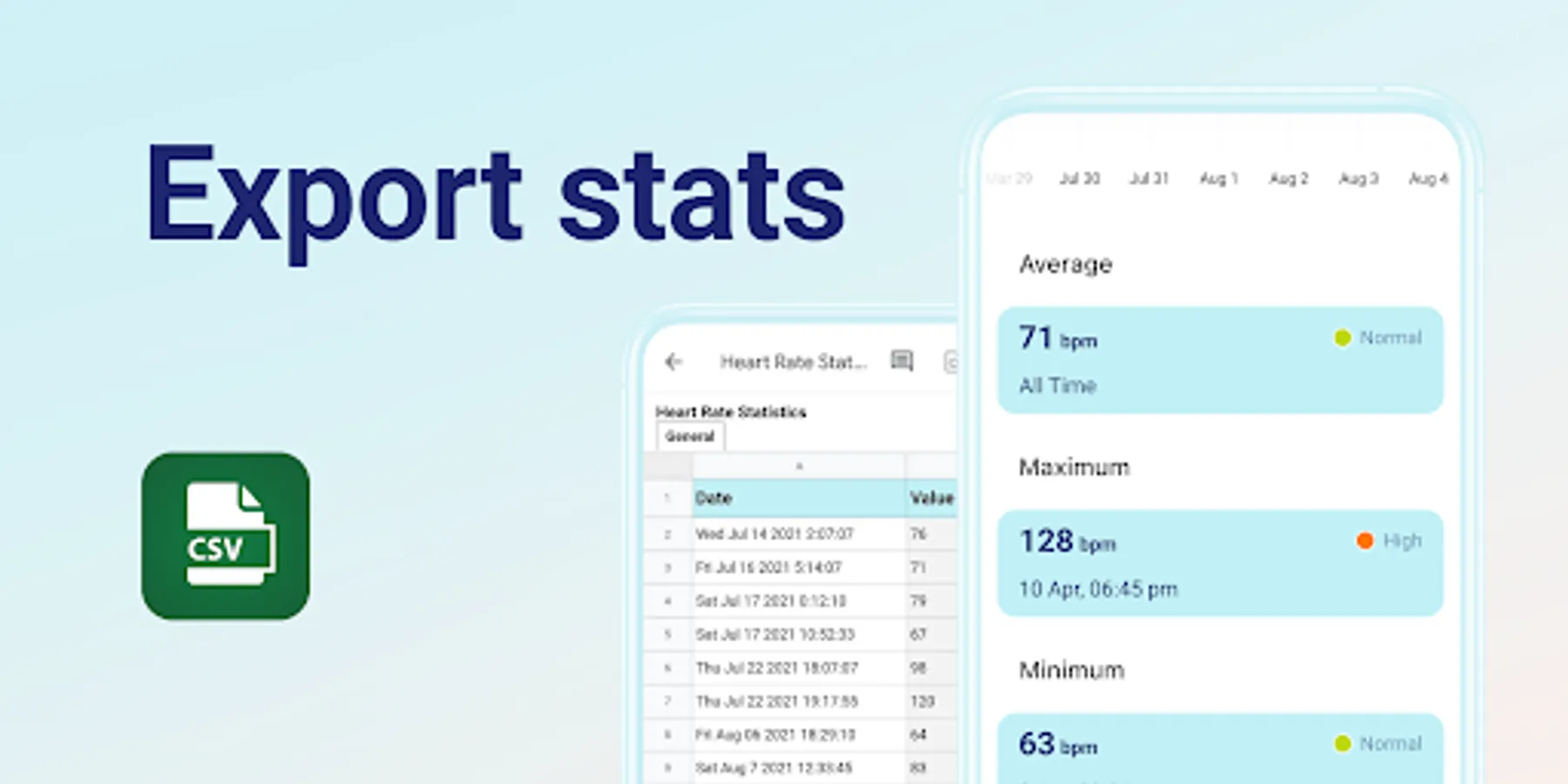 View your average, minimum and maximum pulse and check your heartbeat history for patterns. Get an explanation of the data. Compare your heart pace from one week to the next and find out your heart rate variability. Export data for your doctor.