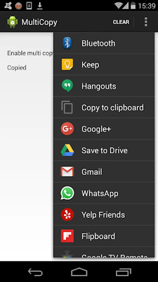 - Copy from multiple sources like browers or from apps by selecting text, copy links, text/html from hangouts,whatsapp, etc