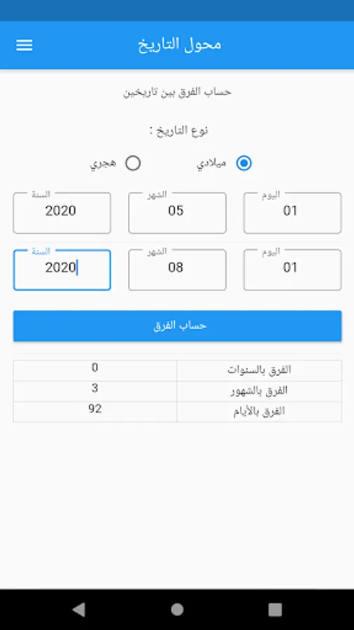 In addition to the service of converting Hijri and Gregorian dates, the application also allows the ability to calculate the exact age in Hijri and Gregorian, so that you are provided with your age in years, months, days, and even minutes.