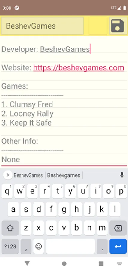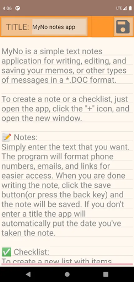 Simply enter the text that you want. The program will format phone numbers, emails, and links for easier access. When you are done writing the note, click the save button(or press the back key) and the note will be saved. If you don't enter a title the app will automatically put the date you've taken the note.