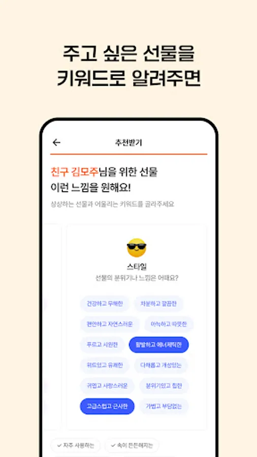 내가 선물하고 싶은 사람의 취향 및 정보를 입력하면, 그 사람과 딱 맞는 선물을 추천받을 수 있어요.