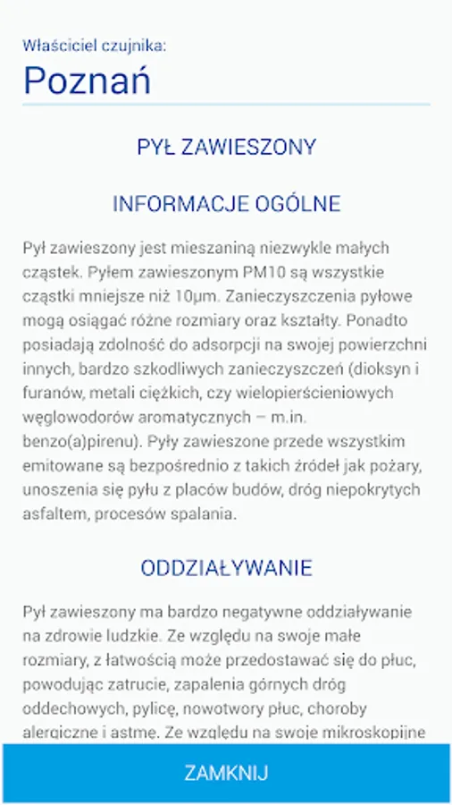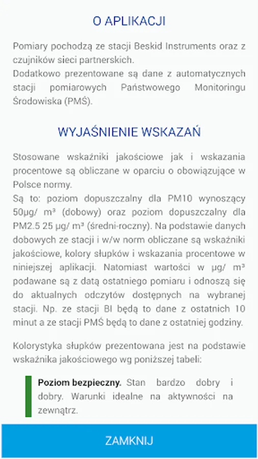 The basic function of the application is to display the current air condition for substances such as suspended particulate matter PM10, PM2.5 as well as humidity and temperature.