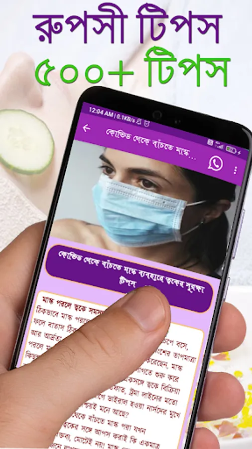 আমাদের এই অ্যাপের মাধ্যমে আপনি খুব সহজ ও সরল ভাবে সম্পূর্ণ ঘরোয়া উপায়ে জানতে পারবেন মাস্ক ব্যবহারে ত্বকের সুরক্ষা টিপস, মেয়েদের বেশ কিছু ফেসপ্যাক, ব্রণের গর্ত, র্যাশ, লালচে ভাব দূর করার জাদুকরি উপায়, সুন্দর পায়ের জন্য কার্যকরী টিপস, রূপচর্চায় ভেষজ উপাদান , প্রাকৃতিকভাবে ফর্সা হওয়ার সহজ পদ্ধতি, ফর্সা হওয়ার অসাধারণ পদ্ধতি, রূপচর্চায় মুলতানি মাটি, রাতে রূপচর্চা টিপস, ঘরোয়া পদ্ধতিতে চুলের যত্ন, খুশকি দূর করার হার্বাল সমাধান, ঘরে বসে পার্লারের মত মেকআপ করার কিছু দারুণ টিপস৷