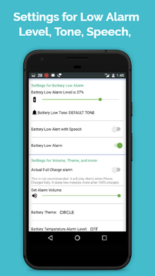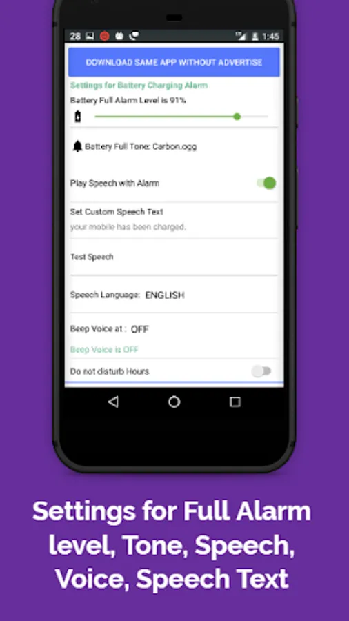 Also there is Speaking Battery Alarm feature. This is a Complete and best Battery Alarm App to protect your phone from overcharging.