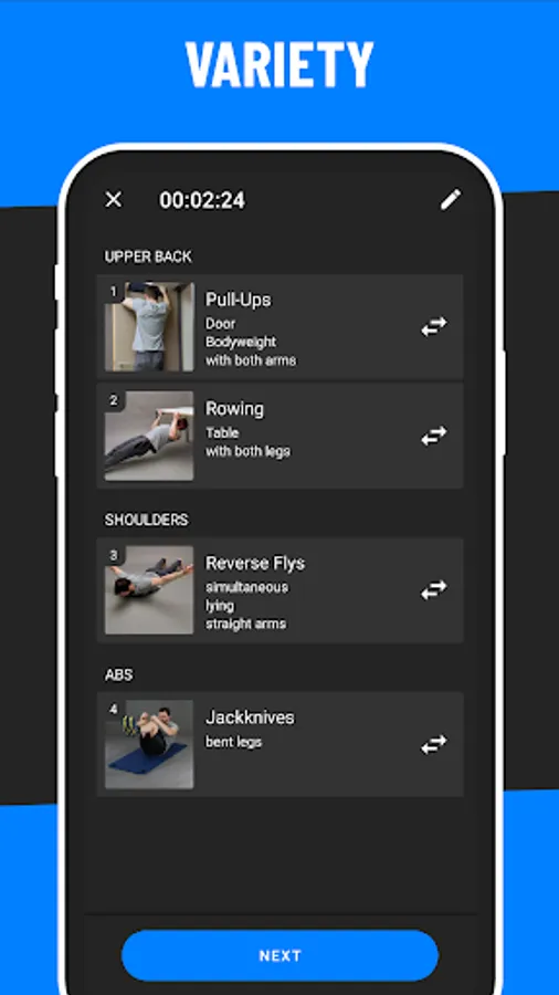 Only bodyweight or with equipment, but only the dumbbells, design your plan as you want it to be! You can decide and adapt your home workout to your needs, but that does not stop the individual adaptation. BestFit Home is the only app that allows you to further customize your workout. Swap, remove or add exercises to your workout plan. It's up to you how you want to personalize your workout.