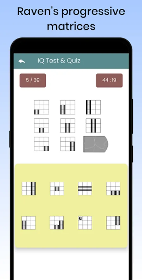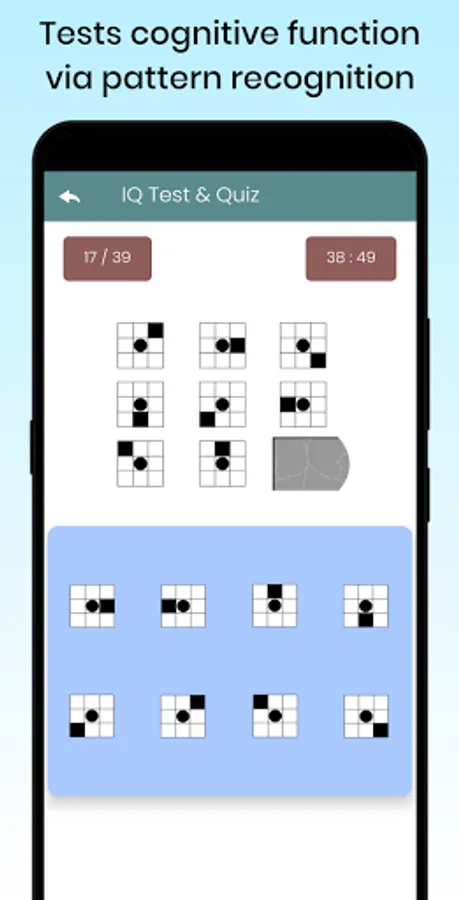 IQ Test & Quiz is based on Raven’s progressive matrices and tests cognitive function via pattern recognition.