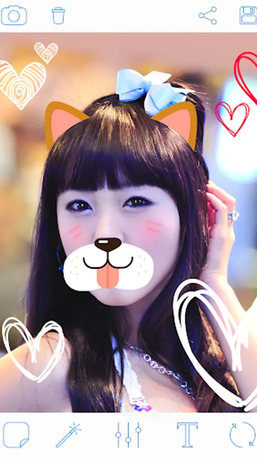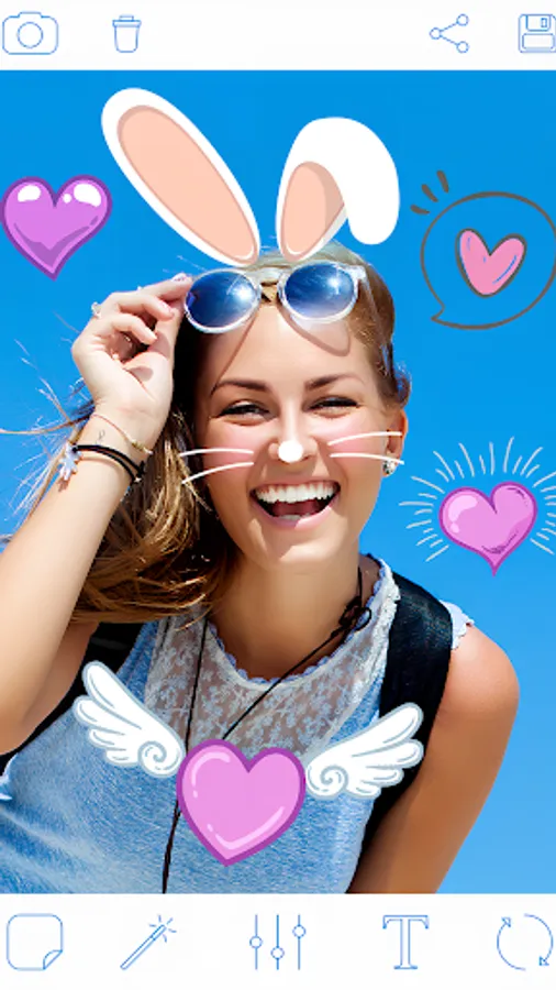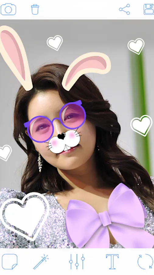 ♡ Add Rabbit or cat ears stickers, rabbit muzzles stickers, cat mouth stickers, cute glasses stickers or sweet heart stickers on photos with Rabbit Face!..