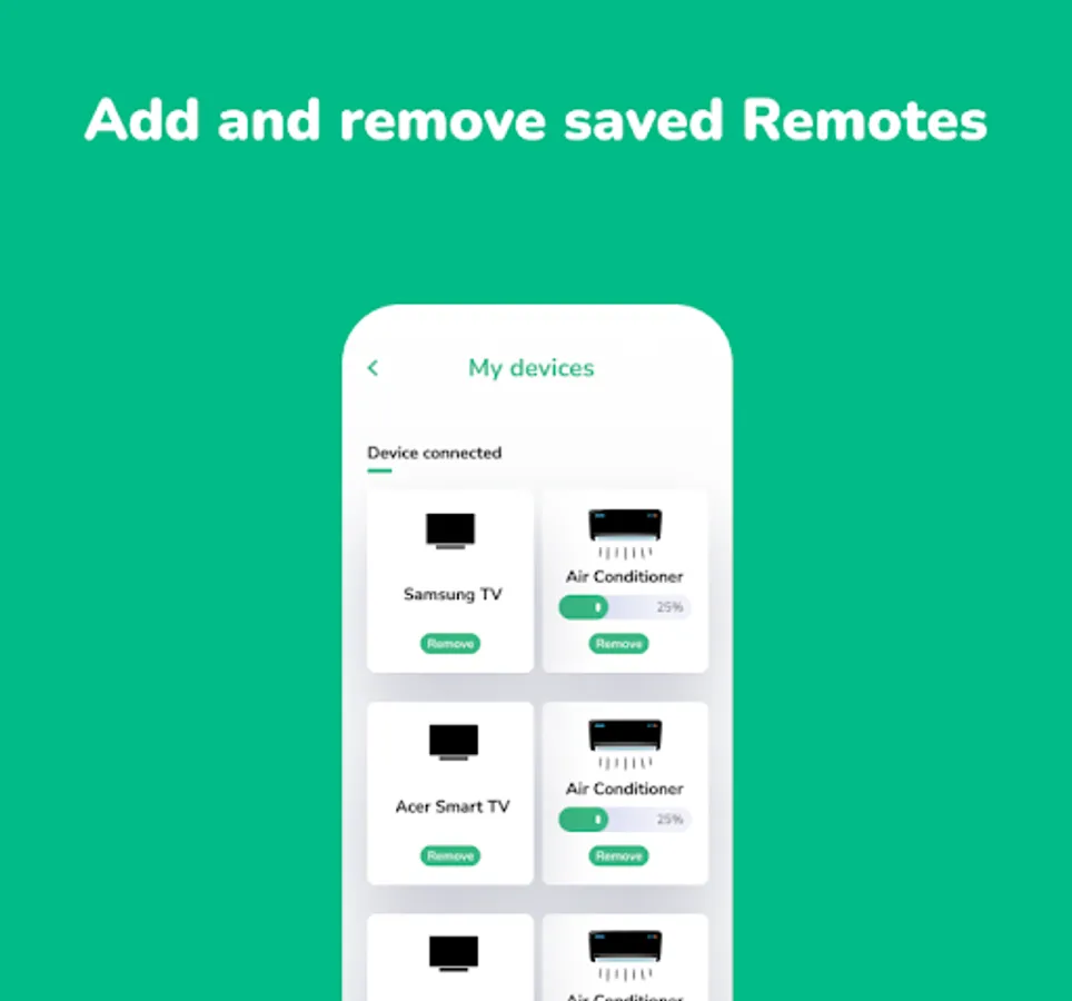 Easy Remove Remote ControlIf you want to remove a universal tv remote, or smart remote from the saved remote control list, it is super easy. Just press the Remove button and it will be removed from the list, and whenever you want to reconnect this remote with you TV or AC, you can do the same process again as the first time.