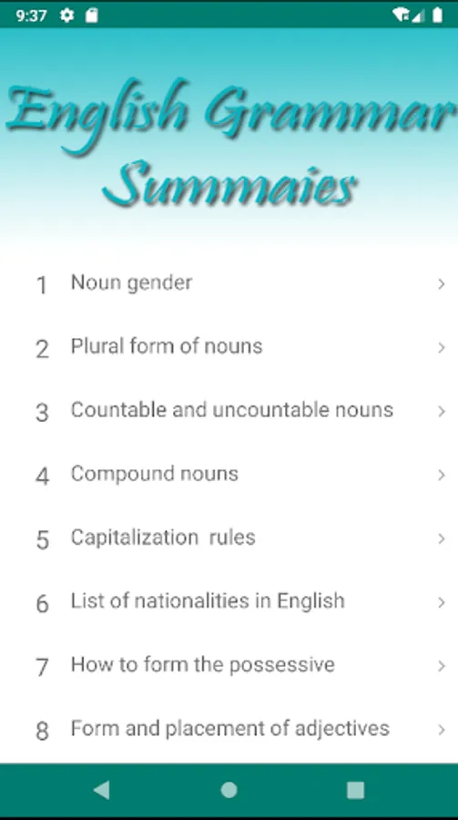 With this app, users can easily access summaries of key grammar rules, such as the use of verb tenses, sentence formation, pronouns and adjectives. The summaries are clear and easy to understand, allowing users to quickly become familiar with the basic rules of English grammar.