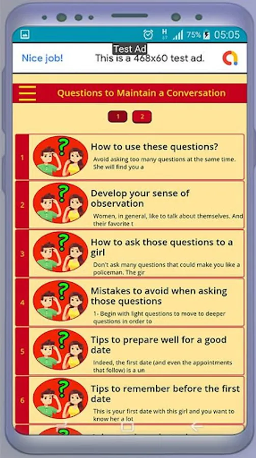 Often, the men or women at the beginning of relationship tends to be silent, while the man or woman wants to know each other and get closer for that they need questions that can create a dialogue between them. Do not worry, with our application you will learn these questions that you ask to reveal who she is or who he really is.