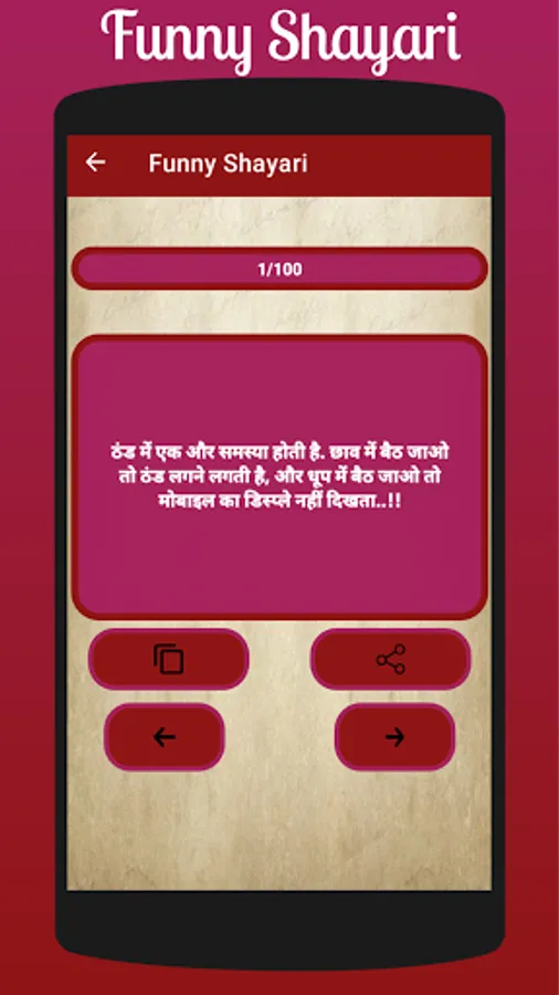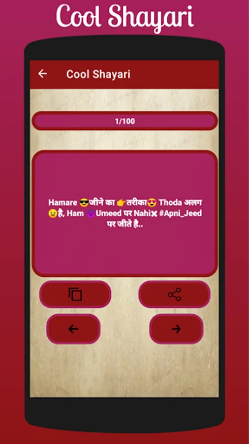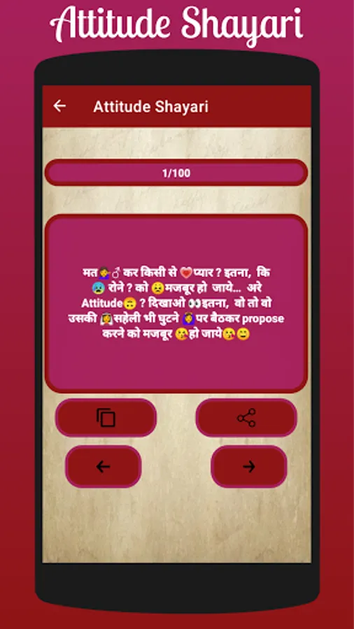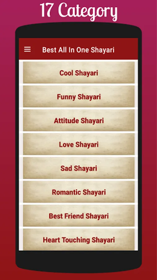 Best all in one shayari in hindi 1000+ is very easy to use.This app UI is very simple for users.In app there are 17 categories for shayaries.Each category has many shayaries,like cool attitude love funny shayries birthday wishes and many more.