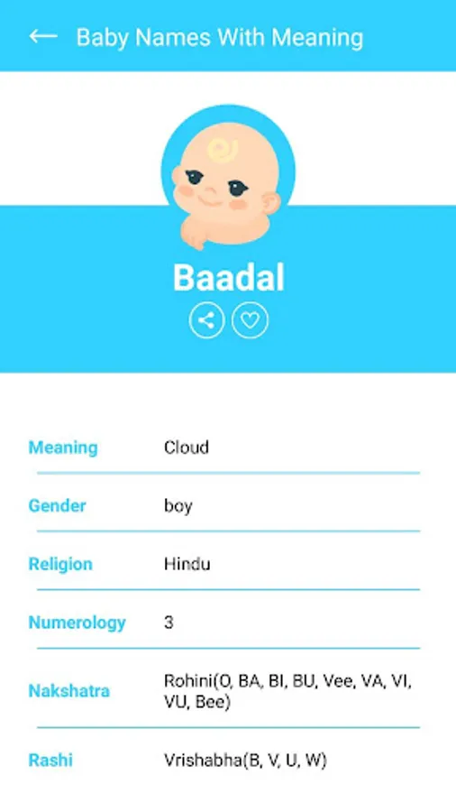 You can easily add the shortlisted baby names to the Favorite Screen. you can share your favorite name details on any social media. find a unique name for your baby.