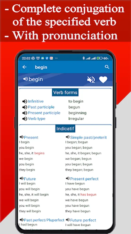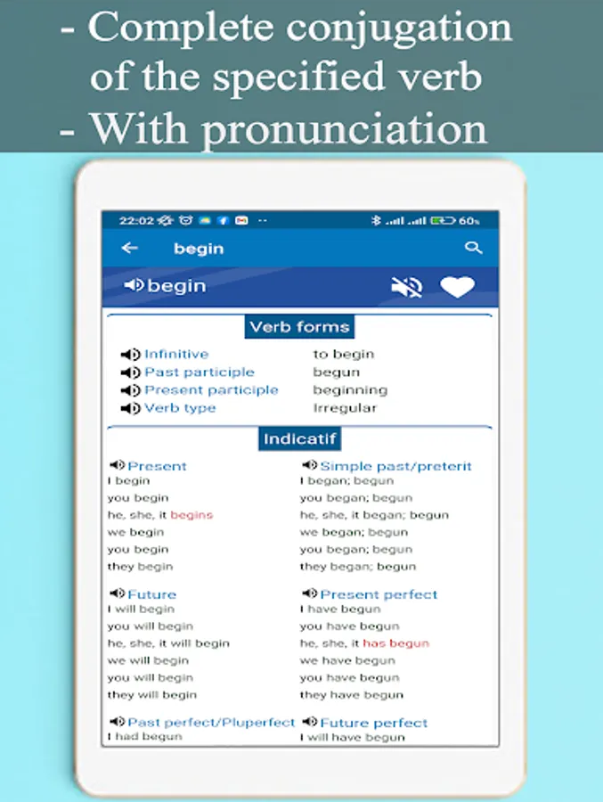 Practice and test your English conjugation skills with our app. Choose between modes and tenses, and regular or irregular verbs. Use our verb conjugator to easily search and conjugate any verb you want. Free and offline!