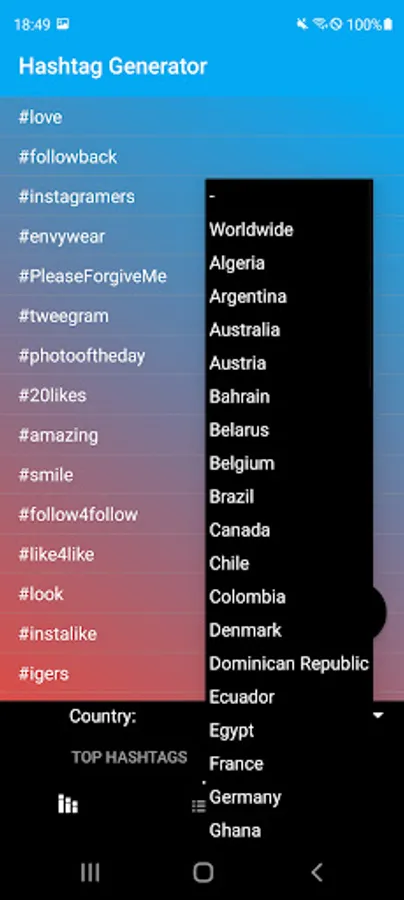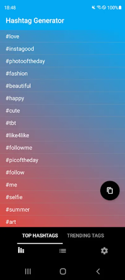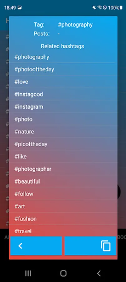 You can use this app as a hashtag generator, you can easily find new hashtags to promote your posts. All found hashtags will be displayed as a list. You can copy this list of hashtags in whole or separately. Also, for the app to work properly, an Internet connection is required.