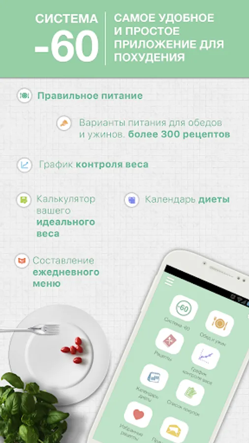 Our app includes everything you need for a comfortable weight loss under the "Minus 60"!