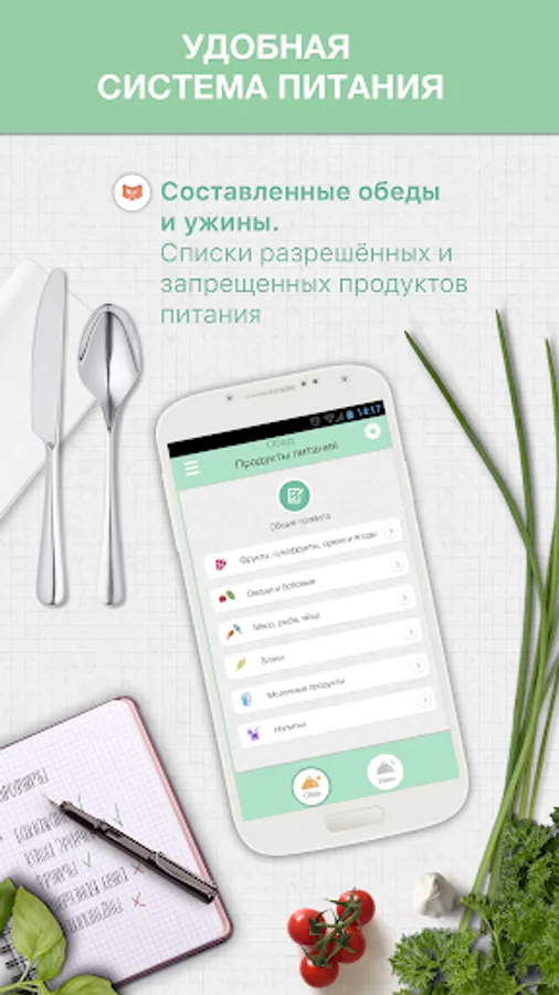 * Food for lunch and dinner! menu options for lunch and dinner, prohibited and permitted foods, the recommended product mix.