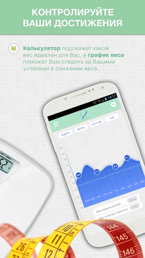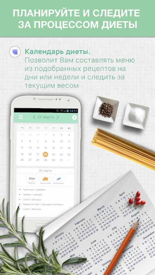 * Diet Calendar with your menu be at least a month in advance! Also on the calendar, you can make your current weight, in order to see your progress in the Schedule of weight control.