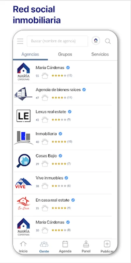 2.-People: Our real estate social network with a preloaded national directory where you will find advisers, real estate groups and service providers. Create your agency with one or more advisers. The properties that you upload in your WhatsApp groups will now have order and will be easier to find.