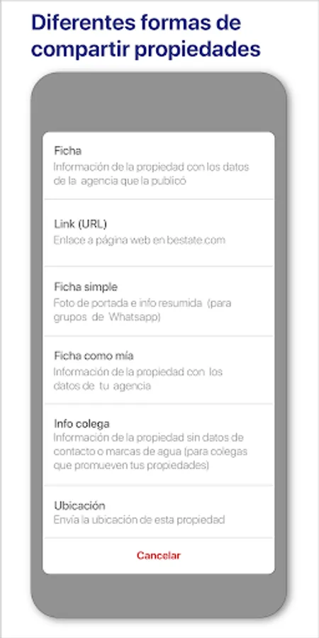 -Different ways to share information about your properties: File for mobile, PDF, QR code, simple file (for WhatsApp groups), property files of other advisors with your data (or vice versa), location, link (URL), etc. .