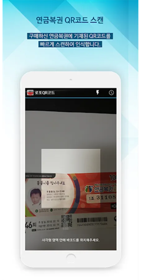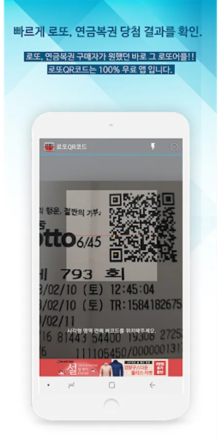 Lotto QR Code (Lotto QR Code) app provides the ability to quickly recognize and scan the lottery winning numbers provided by Nanum Lotto (Lotto6/45) to check the winning results of the lottery number, lottery winning number, and pension lottery.