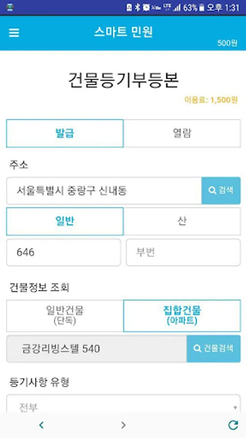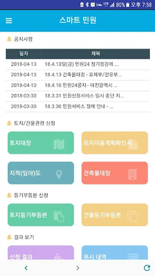스마트민원은 2017년 4월부터 운영중인 기업용 부동산문서 발급시스템을 개인사용자가 이용할 수 있도록 신규 개발한 유료서비스로 사용자가 신청한 주소의 부동산 문서를 해당 정부기관에서 발급 받아 PDF파일로 제공합니다.