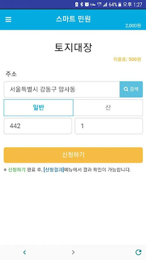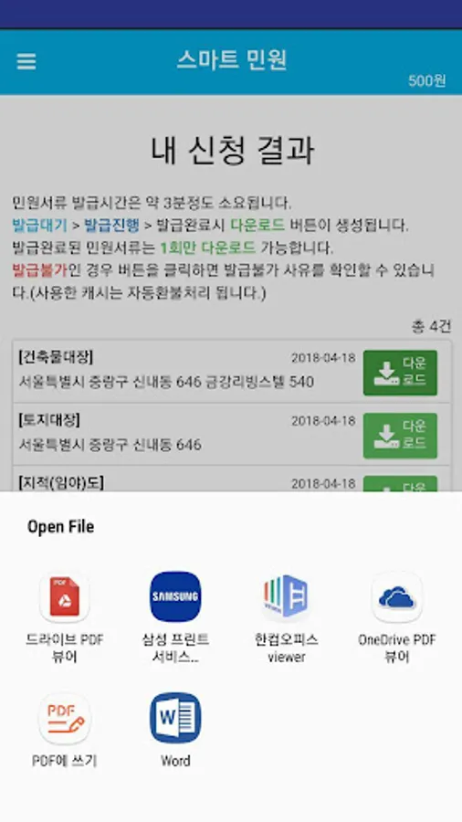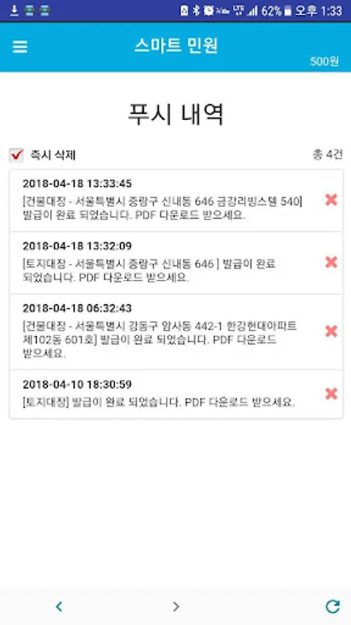 - 발급 대상 주소를 입력 후 결과를 푸시메시지로 수신하여 편리합니다.