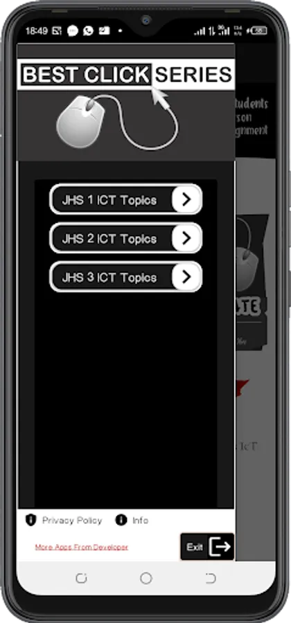 This app is the android version of Best Click Series ICT textbook FOR JHS 1 students and ICT teachers in Ghana. This android book app was created by Umar Abubakar Siddiq Ibn to make the teaching and learning of ICT in Ghana handy and encourage students in Ghana to use their android phones and tablets for learning.