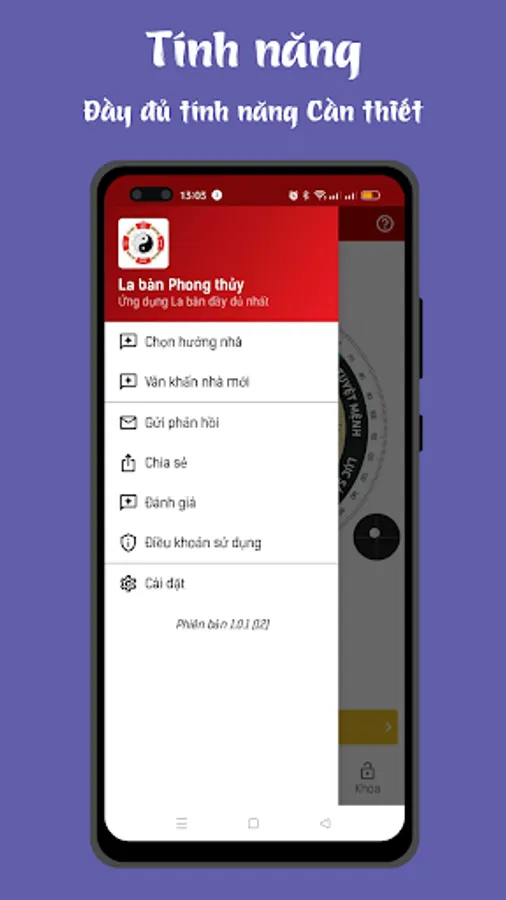 The feng shui compass with the compass automatically rotates according to the position and orientation of the phone to see the feng shui of the house direction, door direction, kitchen direction, desk direction.