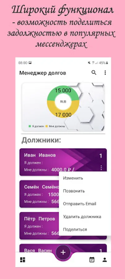 - Ability to "share" (send information about debts through other services such as Telegram, WhatsApp, SMS, etc.)
