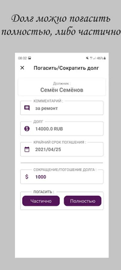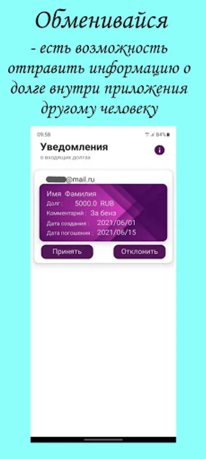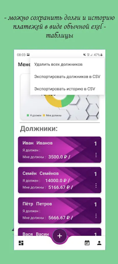 The application is designed to store information about debtors and their debts. The history of payments is stored (when, to whom, for what the payment was made), as well as reminders of upcoming payments. There is also a built-in notepad for storing additional information. For registered users, added the ability to exchange debts with each other within the application. There are no paid services in the application!