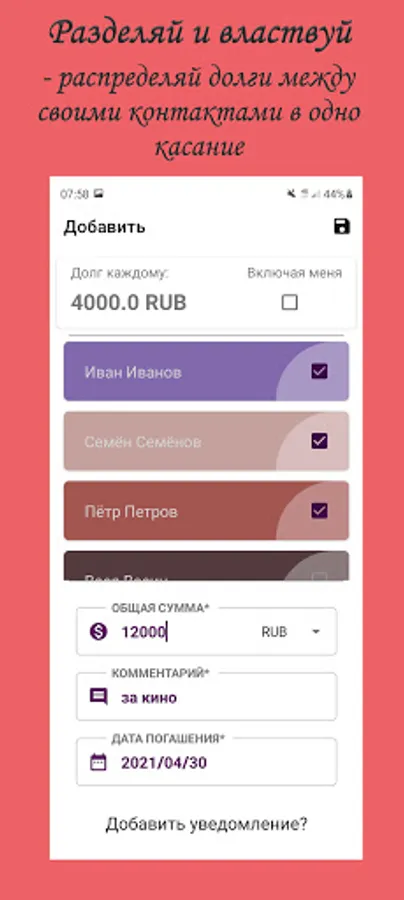 With this application you will save your and other people's money. And you will not forget to pay or return the debt.