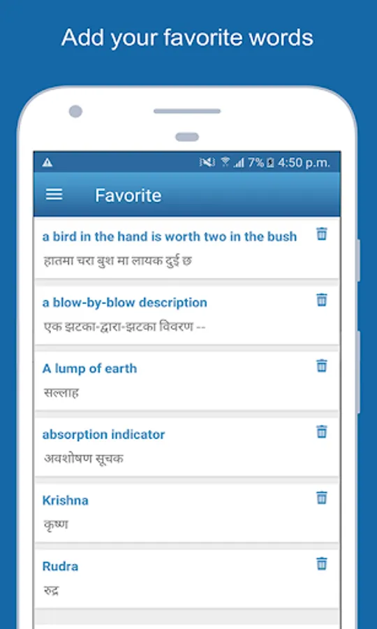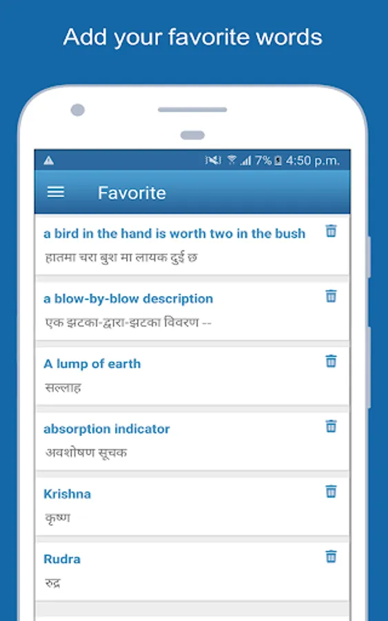 - Want to save a word meaning in the favorites? Tap the heart button and we will add this word automatically in your favorites. You can easily access to it anytime within the favorites choice in the options menu.