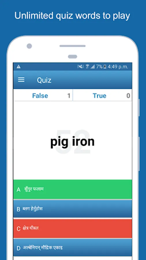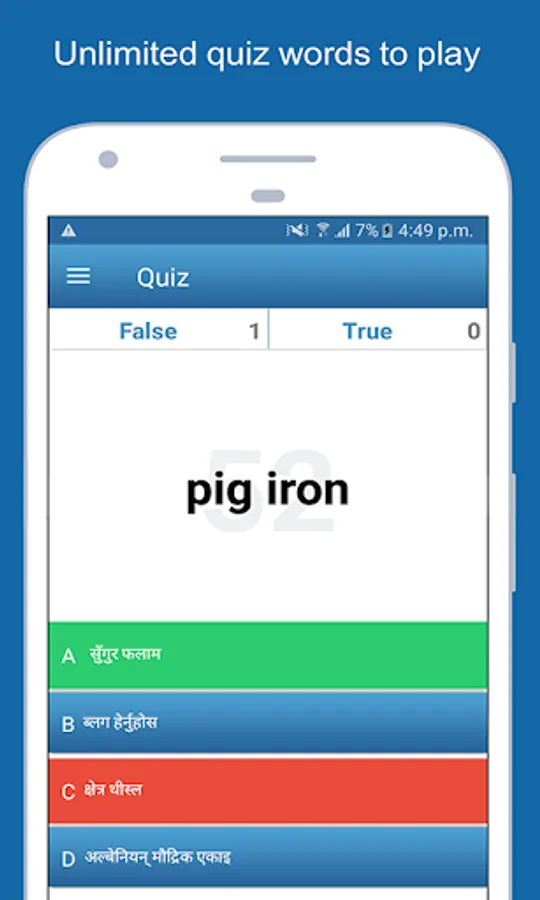 - We developed a new quiz inside Nepali dictionary! To take the quiz, you can easily tap the option icon in the top left side of the screen and choose quiz. Now, you will see a word in the screen with 4 answers, you will have to tap the answer that you think its right to see if it’s the good choice or not. Keep in mind, that there is a countdown timer and if it finishes without a reply from you, then the quiz will ends.