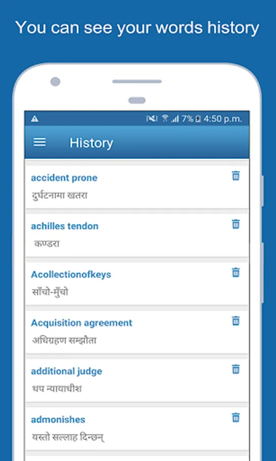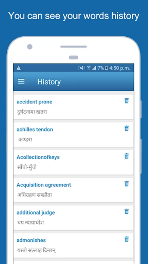 - We will automatically save any word that you searched. You can easily access to it later within the history choice in the options menu.