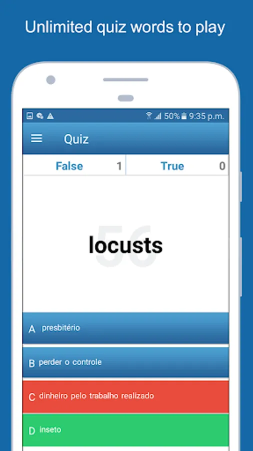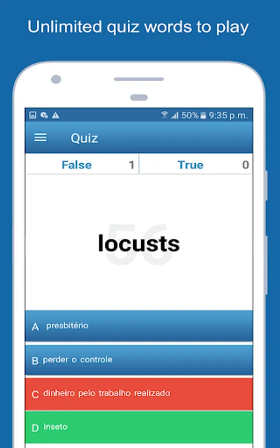 - We developed a new quiz inside Portuguese dictionary! To take the quiz, you can easily tap the option icon in the top left side of the screen and choose quiz. Now, you will see a word in the screen with 4 answers, you will have to tap the answer that you think its right to see if it’s the good choice or not. Keep in mind, that there is a countdown timer and if it finishes without a reply from you, then the quiz will ends.