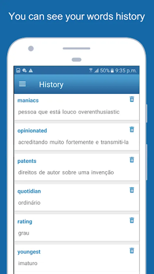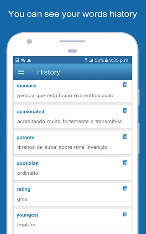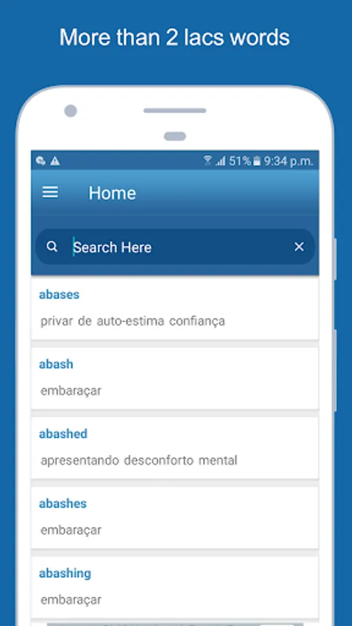 - We have a very Easy Interface to use, so everyone can use it simply without watching any tutorial. We worked hard to make everything easier to you. In the main screen, you will be able to see all words. There, you can type the english word that you are looking for and we will take care of finding the meanings of this word in Portuguese language.