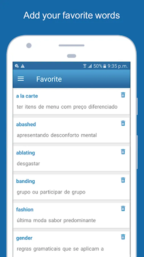 - Want to save a word meaning in the favorites? Tap the heart button and we will add this word automatically in your favorites. You can easily access to it anytime within the favorites choice in the options menu.