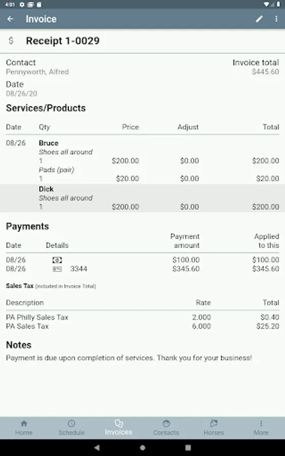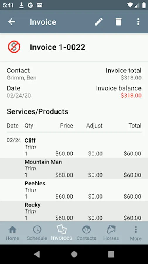- Keep a detailed horse history timeline, auto-generated from your invoices. You can also add your own notes and pictures to the horse history.