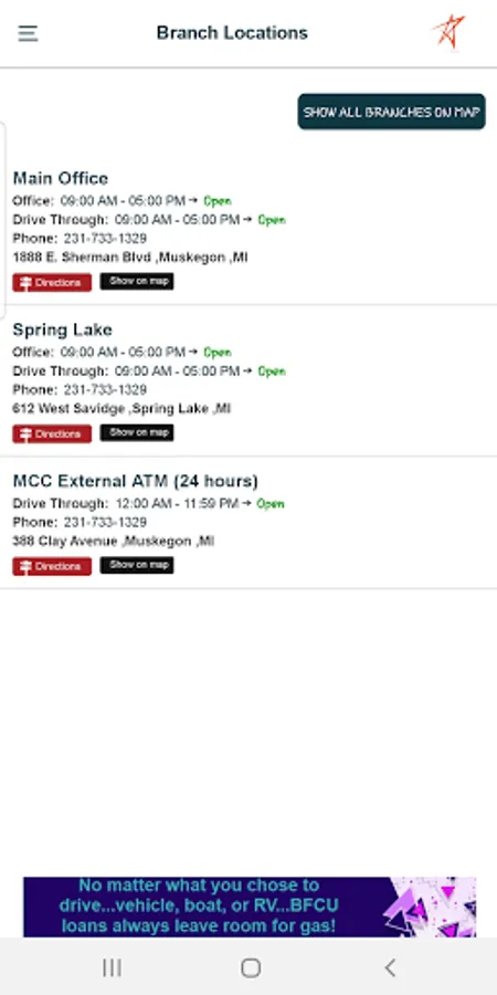With a single tap, you can find the fee-free ATMs and Shared Branch locations near you. Our search feature provides addresses and branch contact information.