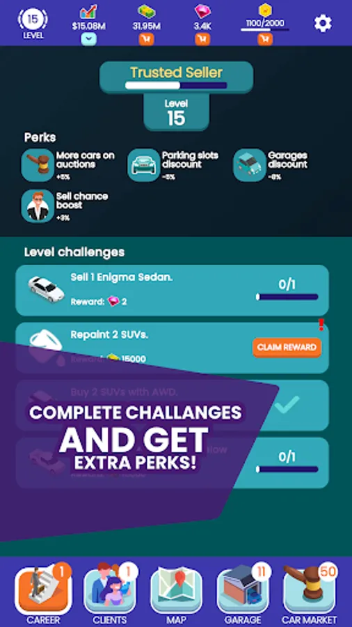 🚗 Perk System - every 5 levels get unique bonuses such as increased sell chance of a car.