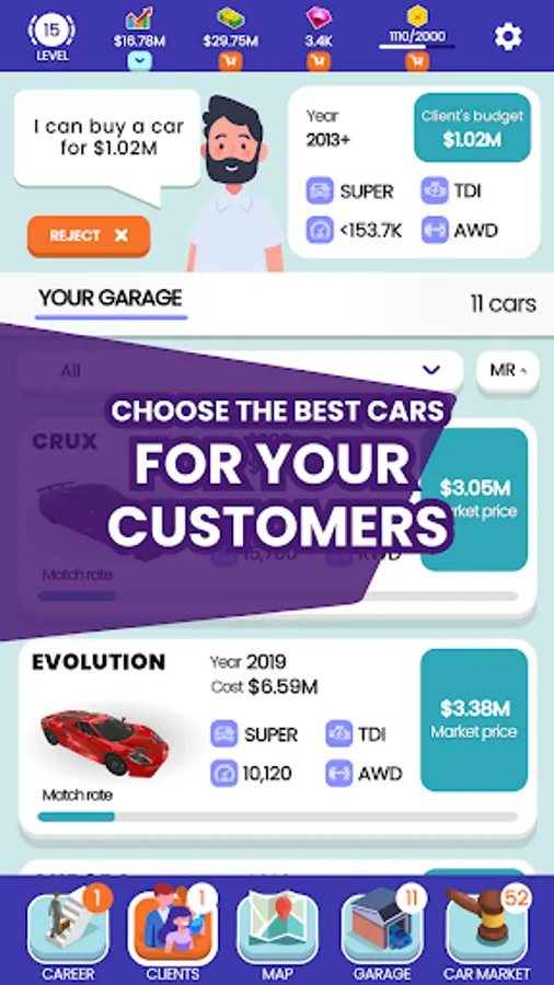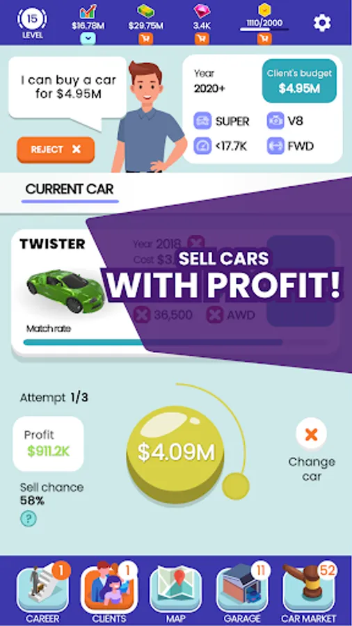 Have you ever thought what it's like to run and expand a used car business? Play as a young entrepreneur and make your own career! “Used Car Dealer” is a used car simulator game that simulates the process of purchasing and selling used cars. You will have several ways of purchasing cars, and almost 100 different car models to choose from. The clients have specific needs. One of your tasks is to find the most suitable car for them!