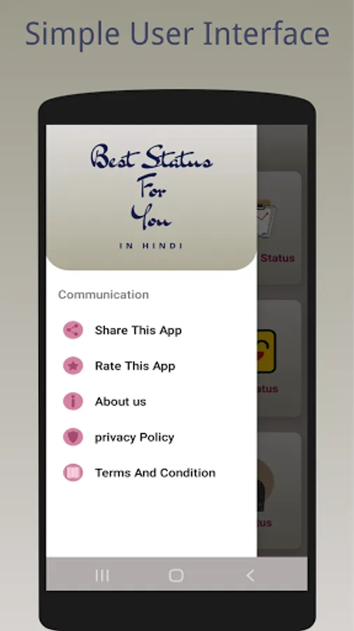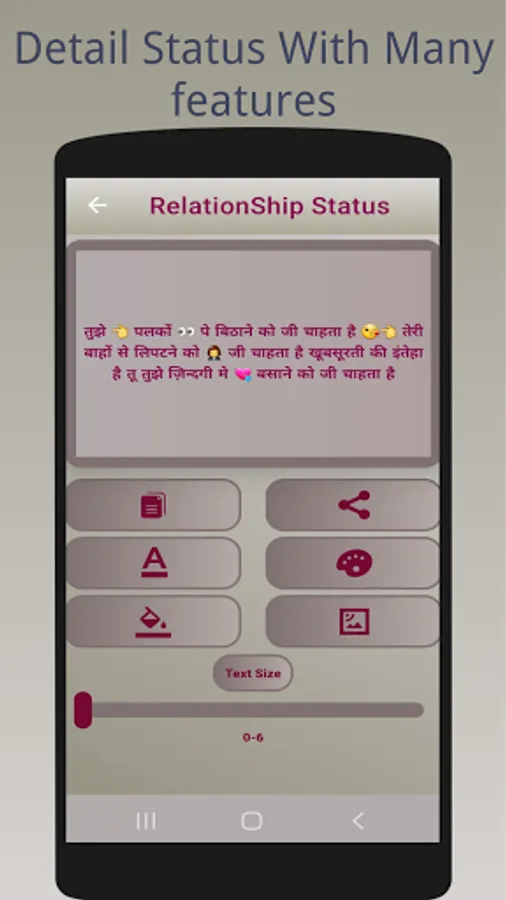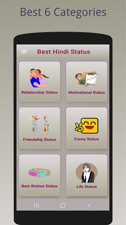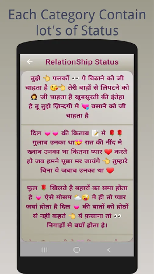 Hindi Status Lover And Latest Shayaries For You.This app contain 6 best categories. The app UI is simple to use. In 6 category there are many status in hindi like Relationship,Motivational ,Friendship,Funny,Best Wishes and Life status. Each status are detailed with many features.