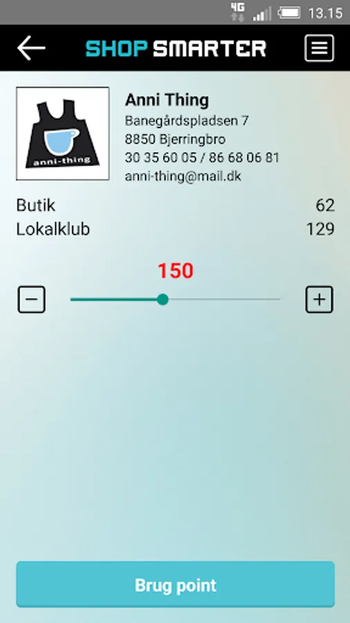 To do this in all the affiliated shops and businesses. Every shop and business in Denmark is able to establish themselves in Shop Smarter and thereby make their own customer club. The stores are listed in Shop Smarter based on postal codes in the menu "Store". The shops are also able to get together in a common loyalty club for the whole city. You can - in some places - earn bonus points for both the individual shops and the city's joint loyalty club.