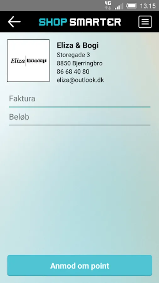 If you shop in a store where you pay immediately ask your bonus points. The clerk must use your cell phone number to transfer points to you. If however you have been visited by, for example, a painter, who is in Shop Smarter, you will receive an invoice for this work. When this bill is paid, you go to the "Request point" in Shop Smarter. Here you first select the company you want to request credits. As you enter the invoice number and amount and press request. So the company will be able to approve your anmodnig - and your points will get into your account.