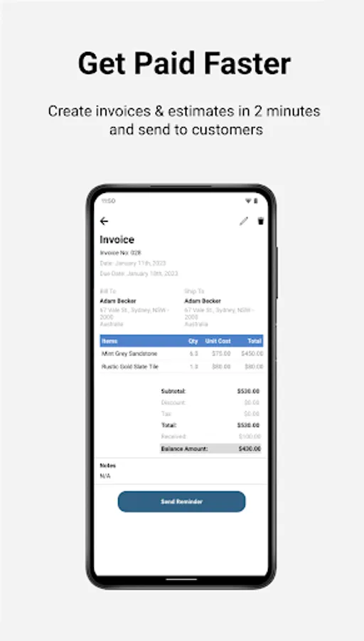 • Track past invoices & estimates with one tap to know their history